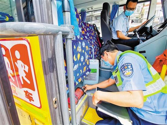 民警就校车驾驶人资质、行驶路线、车辆审验等情况进行认真检查核对,仔细查看了校车的安全设施、消毒防护措施和消毒情况。重点检查校车的轮胎、安全带、医药箱、消防器材、安全手锤、安全出口、外观标志等设施,并现场确认车辆和驾驶人校车运营资质,事故、违法记分情况,要求严格校方负责人、驾驶人落实安全责任,全方位排查校车安全隐患,确保不带“病”上路。