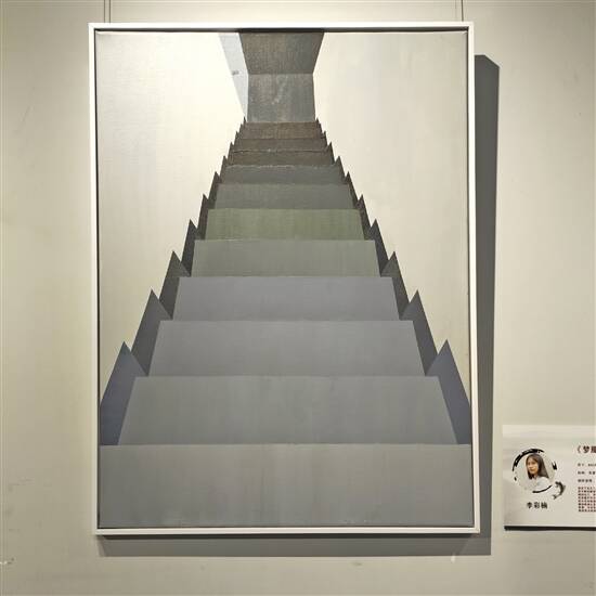 日前,在美中高三毕业作品展上,李彩楠同学一幅名为《梦魇》的画作,讲述困扰她八年的“下楼梯恐惧症”。她运用色阶的方式体现楼梯的空间感和平静,通过平整的线条以及色块组合形成一种视觉冲击效果,营造一种对楼梯的畏惧感。她说,希望能借此让大家了解并关注到“下楼梯恐惧症”这种心理疾病。