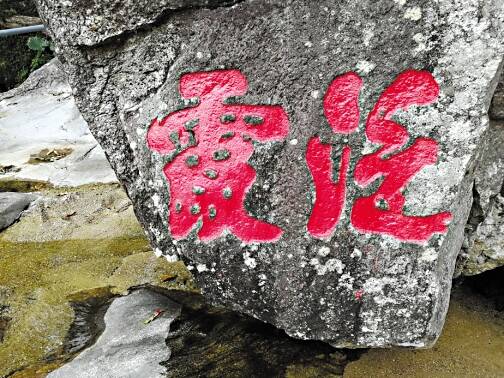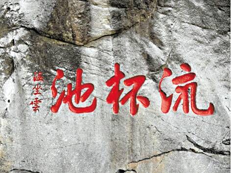 与修禊摩崖石刻形成鲜明对比的是,位于歌舞石(黄龙瀑布顶)的“流杯池”题刻十分清晰,保存较好,常有游客前来观赏。何启文说,“流杯池”之名正取自兰亭序之“曲水流觞”,古人把酒杯放在木质托盘中顺水漂流,漂到谁面前停住,谁便要饮酒赋诗。