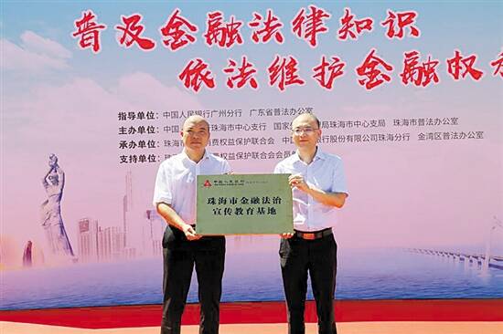 活动中,人民银行珠海市中心支行副行长唐黎军向金湾区司法局局长谭高明授予“珠海市金融法治宣传教育基地”牌匾(见上图),标志着双方以此次金融法治宣传活动为契机,携手合作、共同努力,致力于将金融法治公园打造成全国级金融法治宣传示范标杆。