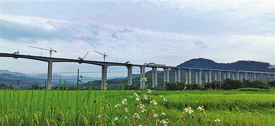 在高近百米的红旗特大桥桥面,记者看到,十月金秋的夕阳笼罩下,特大桥右幅桥梁已顺利完成合龙,左幅桥梁只剩最后一段等待合龙,工人们正在桥面上紧张施工。项目周围是连绵青山环抱,距桥面近百米之下点缀着森林、湖泊、农村小屋等原生态风光,庞大的现代基建项目与绿水青山相映成趣,构成了一幅美丽的画面。