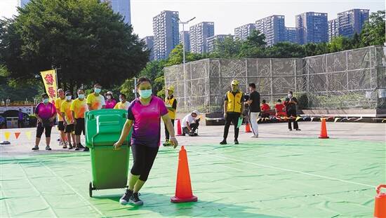 羊城晚报讯 记者欧阳志强、通讯员陈明摄影报道:“加油!加油……”随着一声哨响,只见一名身穿紫色运动装的环卫阿姨拉着一个垃圾桶快速地向前运动,途中绕过3个障碍物,到达独木桥区域,放下垃圾桶,根据裁判员提供的垃圾图片,阿姨熟练地把图片投放到相应类别的垃圾分类桶内,完成分类后,又把垃圾桶带回起点进行接力,整个过程一气呵成。两边围观的人爆发出热烈的掌声,眼前的这一幕正是禅城区城市管理和综合执法局举行的2020年环卫工人趣味运动会的场景。