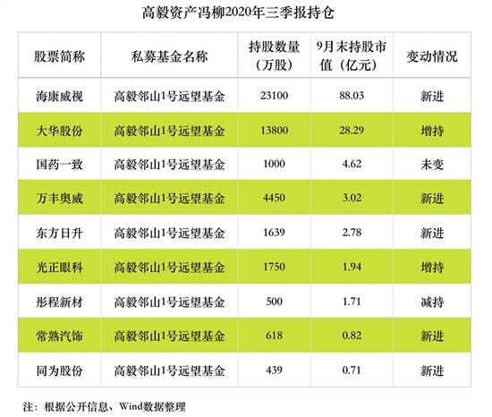 值得注意的是,除大幅买入海康威视外,高毅邻山1号远望基金还位列国内第二大安防企业大华股份(002236)的第二大流通股股东,持股数量为1.38亿股。以10月26日收盘价21.85元计算,该笔持股市值超过30亿元。Wind数据显示,在两只龙头股的带领下,10月26日安防板块整体也表现亮眼,涨3.04%,15只成分股中仅有英飞拓、高新兴、中国海防收跌。
