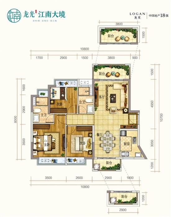 入围理由:该户型为龙光·江南大境的畅销三房设计,建筑面积约100平方米,双阳台南北对流,通风和采光条件俱佳,整体动静分区布局,十分符合国人的生活习性。约3.8米大面宽的景观阳台,俯瞰城市繁华景观,约2.9米面宽的生活阳台,方便收纳和日常起居,细节之处体现人性化设计。