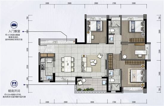 入围理由:117平方米全能四房,入门长约4.5米的大飘窗,空间灵动,既可打造成休闲区,又可变身收纳空间,还可营造迷你花园,给居家增添绿意。创新性横厅设计,朝南开间达到了约6.8米,整个户型的面宽达到了13.6米,极大地增加了采光和通风效果。阳台开间约3.9米,面积约7平米,比一般的房间还大。同样拥有双卫生间配置,干湿分离,明卫通风。奢阔四房,主人房、儿童房、老人房、多功能房,陪孩子长大、陪父母变老,任何珍贵的时光都不容错过。