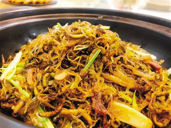 禾虫是斗门特有的,而且是只有秋天的这个季节才能吃得上的,由于蛋白质丰富,也是不少食家的心头好,每年这个时候,都会念念不忘地驱车前往金胜酒家品尝。此前吃过的禾虫通常都是加入鸡蛋一起焖或者炒,头一次吃到和粉丝配在一起的。禾虫在大厨的精心料理下,即使和粉丝配在一起翻炒,依然还是保持原状。吃到嘴里,是满满的蛋白质味道,真香。