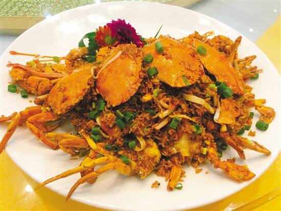 今天吃了一道从未吃过的美食。酱米焗奄仔——这道菜色泽很好!鹅肝黑松露蒸米饭再加上正宗的海蟹和蟹柳一起来焗,蟹膏非常的多,吃起来会有一种嫩滑香蜜的感觉!蟹肉也很饱满,甜滑可口,米饭香香的,很不错!此外,招牌菜芝麻鸡,皮脆肉嫩,上面裹上一层白芝麻,烤得脆脆的,别有一番美味,真的是值得一尝!