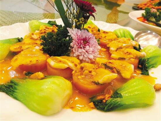 自己以前在酒楼也吃过海鲈,以为和以前一样,端上来的无非是一条清蒸鲈鱼或煎炸的鲈鱼,要不然是一道以海鲈鱼为料做的酸菜鱼,但是当一道金黄中透白、绿意点缀的美味端上桌时,自认为吃过很多鲈鱼菜式的我,硬是没认出来这是一道产自白蕉的海鲈菜。原来,经过金胜酒楼精心炮制,这道名为金汤果仁鲈鱼中的金黄是以焖汁打底,辅以黄色的南瓜、绿油的青菜,再把肉质肥厚刺少的鲈鱼切成片,点缀在南瓜上。一口咬下去,既有南瓜的清甜软糯,又有海鲈鱼的鲜美。
