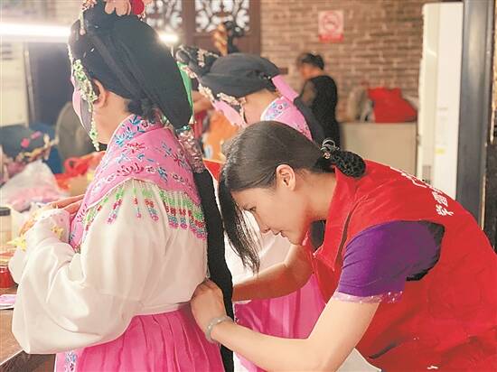 一位志愿者帮助唱粤剧的老人穿上戏服