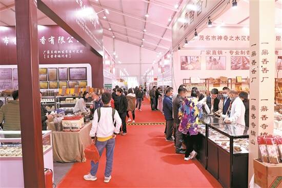 本届香博会引来了不少国内龙头企业汇集,助推产业集聚,为东莞沉香产业注入新活力。据悉,本届香博会以旭生香市文化创意产业园为主会场,中国沉香文化博物馆、牙香街、香博园为分会场,总展览面积超5万平方米,展品涵括沉香全产业链,汇聚了来自东莞本土、广东省内、海南、莆田等地区的300多家参展商参展,不乏各地行业龙头,如沉香山集团、香城集团等。其中,茂名电白沉香协会共有近30家企业/香农参展,成为本届香博会“最大参展天团”。