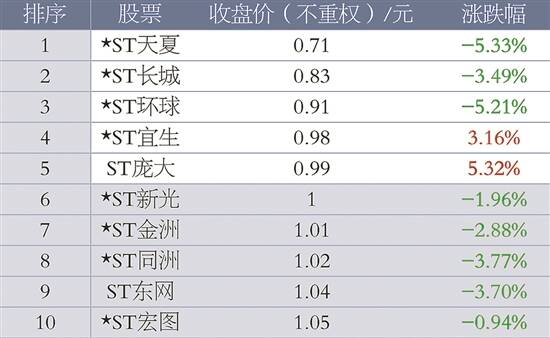 除*ST天夏外,股价低于1元的个股还有ST庞大、*ST宜生、*ST环球、*ST长城四只个股。股价低于1.30元的有*ST当代、*ST节能、*ST金正等24只个股。其中*ST宜生等个股股价已连续12个交易日低于1元,也岌岌可危。