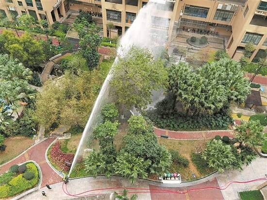 “开始,放水!”确认现场安全后,两位消防员通过对讲机一声令下,在消防车待命的消防员开始加压放水,高压水枪射出来的水柱直射马蜂窝。约2分钟后,马蜂窝已被喷射掉一大半,并掉落在树下。此时,消防员马上关上水闸,和物业工作人员一起查看掉落下来的马蜂窝。大多数马蜂经过水枪喷射已死亡,但为了安全,物业人员还是用杀虫剂在蜂窝上再喷洒一次。随后,消防员再次启动高压水枪把残留在树上的马蜂窝清理干净。