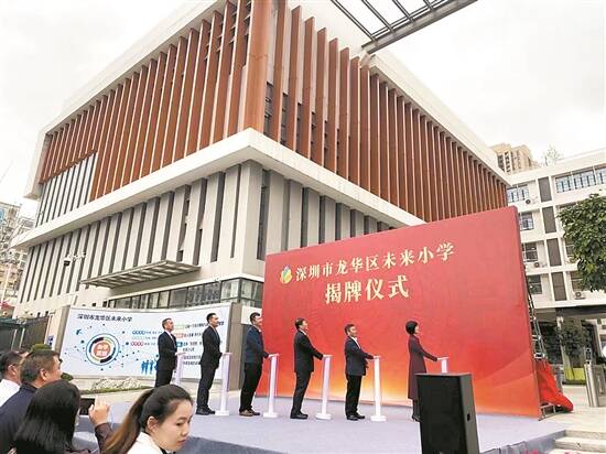 首先揭牌的未来小学,该校原名为上芬小学,有着45年教学历史。更名后,学校将站在更高的起点重新规划,高标准建设,着力促进学校未来课程的开发与应用,培育未来学校示范校,形成“积极教育+人工智能”龙华样本。新校区占地面积24612.87平方米,总建筑面积26519.76平方米。现有教职员工141人,教学班50个,学生2497人。