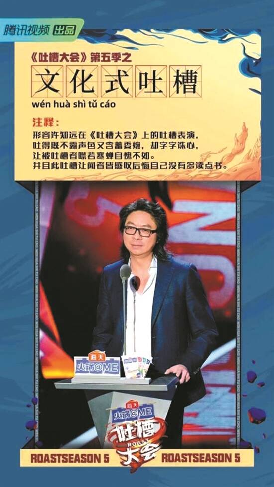 许知远毕业于北京大学计算机系,做过记者、写作者、出版人,也是文化访谈节目《十三邀》的主持人。因为本人气质与《吐槽大会》的综艺氛围并不搭调,他在选人环节一度成为被“嫌弃”的对象。许知远的吐槽中有不少知识点和隐藏梗,现场得票并不算高。未料场内不香场外香,他的吐槽视频在社交网络上迅速蹿红。节目播出方腾讯视频还据此给出了“文化式吐槽”的官方定义:“形容许知远在《吐槽大会》上的吐槽表演,吐得既不露声色又含蓄委婉,却字字诛心,让被吐槽者噤若寒蝉自愧不如。并且,此吐槽让闻者皆感叹后悔自己没有多读点书。” 网友也对他的表现频频叫好:“不带脏字地骂人,真过瘾。”“他改变了脱口秀的格局。”