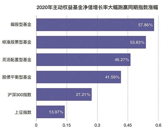 实际上,基金的中长期收益表现还是比较亮眼的。银河证券基金研究中心数据显示,2020年全年标准股票型基金、偏股型基金、灵活配置型基金和股债平衡型基金平均净值增长率分别为53.83%、57.86%、46.27%和41.59%,均大幅跑赢同期沪深300指数和上证指数27.21%和13.87%的涨幅。
