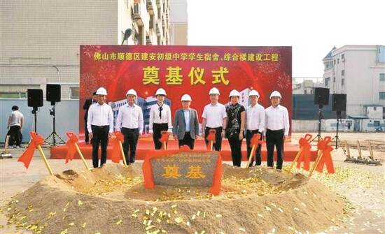 顺德区均安镇16日举行建安中学学生宿舍楼和综合楼工程奠基仪式。此次学校宿舍、综合楼的建设,将进一步解决学生寄宿及基础设备等问题。该工程将新增1300个宿位和13个功能室,预计在今年12月底竣工。
