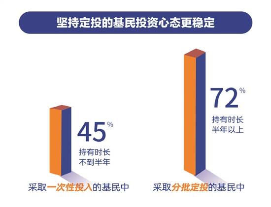 在振荡行情中,定投变成了很多基民拉长投资周期、摊平持仓成本的工具。《一季度基民报告》的数据分析发现:采取一次性投入的基民中,45%的人持有单只基金不到半年。而采用分批定投的基民中,超七成人持有单只基金时长在半年以上,定投基民更加拿得住。