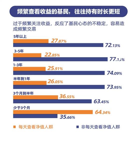 报告的研究还发现,频繁查看收益的基民往往持有时长更短。频繁关注收益反映了基民心态的不稳定,也容易造成频繁交易。