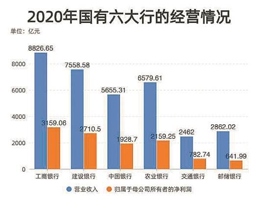 3月下旬,上市银行迎来了年报季。截至3月30日,六大国有银行(工商银行、农业银行、中国银行、建设银行、交通银行、邮储银行)已经全部公布了2020年成绩单。去年全年,六大行累计实现营业收入3.39万亿元,同比增长4.56%;归母净利润为1.14万亿元,同比增长1.93%,相当于日赚31.15亿元。