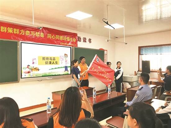 在观看视频结束后,观湖街道综合治理办副主任陈杏儒将禁毒督查团旗帜授予老师和学生代表。其后,陈杏儒和党员代表带领全体师生进行庄严宣誓。