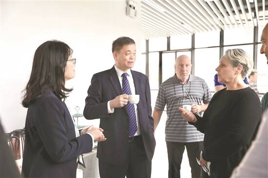 龚新高(左二)与学校外籍老师交谈 蔡慈虹 摄