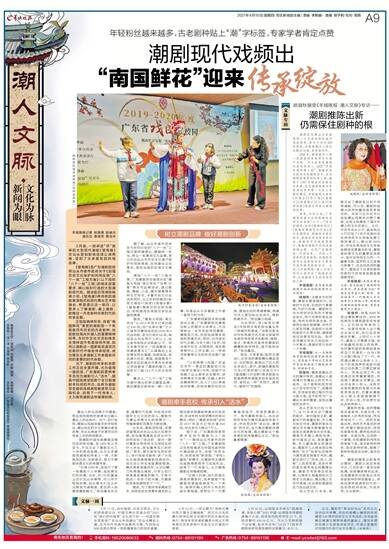 广东潮剧院副院长张怡凰告诉记者,广东潮剧院在潮剧创新上的脚步从未停止,不仅探索出一系列包括传统潮剧、潮剧现代戏、抗疫组曲等多类型的表演方式,同时,创作紧扣时代主题,与多个部门合作,结合城市创文、扫黑除恶、党史教育等中心工作主题,以一种老百姓喜闻乐见的形式去推广宣传。