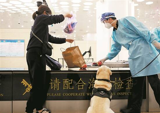“艾奇,好棒!”广智从随身包中取出一把狗粮奖赏艾奇。这些水果是艾奇一个班次的战绩,这些“战利品”随后也将被销毁处理。今年2月份以来,艾奇和两位小伙们累计查获禁止携带动植物及其产品215批次,合计203千克。