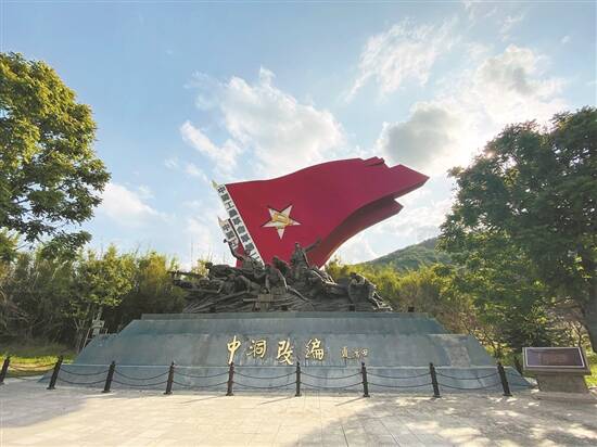 日前,记者随民记走读团来到高潭中洞村。烈日晴空,中洞革命纪念广场上的“中洞改编”雕塑巍然耸立。1927年10月,南昌起义军余部1000多人进入高潭中洞。东江特委按照中共中央南方局和广东省委的指示,对起义军余部进行改编,组成工农革命军第二师(后改称“红二师”)。