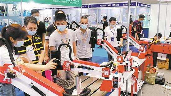 展会现场,一个个小小的、正在运作模拟生产的智能自动化机械臂吸引了不少观众驻足观看和咨询。“这是我们新推出的智能自动生产机械臂,可按生产工序需要专门设计,每个机械臂只要一个工人操控,可替代以前要几个工人才能操作的旧生产设备,而且产品质量稳定保证,大大地解决了制造业企业疫情后用工难的难题。”现场跟客人介绍的参展商广东瑞万科技的负责人说。