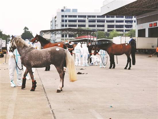 羊城晚报讯 记者钱瑜,通讯员林涛、王东涛摄影报道:日前,8匹来自法国的温血马、迷你马在海关关员的全程监管下,经由广州白云机场入境,抵达珠海斗门晋平马业南澳隔离场。这是时隔两个多月,又一批自欧洲的马匹来到晋平马业的隔离场。经隔离检疫合格的马匹将成为境内马场上的“新宠”。