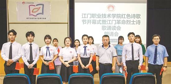 羊城晚报讯 记者陈卓栋,通讯员黄伟亮、冯美琪、纪思佳、韩晓敏、谭耀广摄影报道:记者18日从江门职业技术学院获悉,日前,以“传承红色基因,做新时代好青年”为主题的红色诗歌节暨江门革命烈士诗歌诵读会在该校举行。记者了解到,红色诗歌节活动主要内容包括江门革命烈士诗歌诵读会、红色经典诗歌讲解比赛等。活动以江门革命烈士诗歌诵读会拉开帷幕,将一直持续到今年年末。