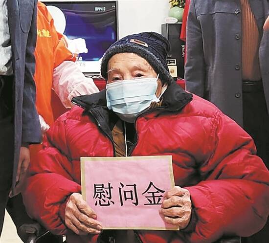 冯老坐着轮椅,支着拐杖,儿子和看护陪同在身旁。他穿着红色羽绒服,戴着毛线帽,一副口罩遮住了半面脸,只剩下一双深邃的眼睛和稀疏的银白色眉宇。