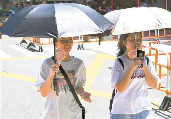 近期天气晴热,市民边撑伞遮阳边吹电扇 羊城晚报记者 王磊 摄