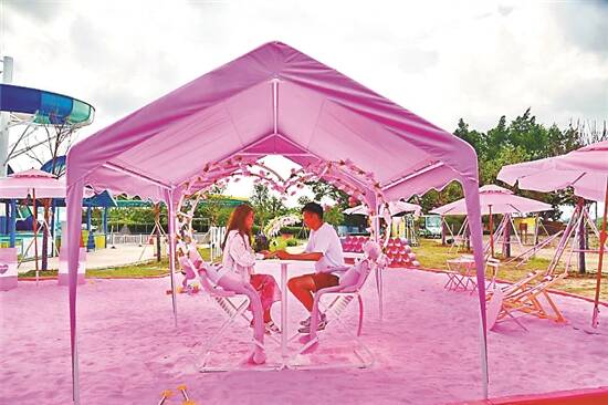 盈香生态园夏威夷水城在今年夏天特意推出了粉红沙滩项目,并在520节日,以承包的方式给年轻人表白、示爱、求婚、晒浪漫,几个沙滩一下子给年轻人订满了。粉红沙滩所有沙子都是浪漫的粉红,沙滩还配有各种各样的粉色装置,营造了满满的唯美浪漫幸福感。