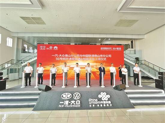 羊城晚报讯 记者张闻、通讯员张金龙摄影报道:5月20日,一汽-大众佛山分公司与中国联通佛山市分公司5G专网开通暨联通AI智能平台上线仪式召开,一汽-大众佛山分公司智慧工厂开启新阶段。