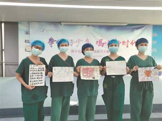 除了合唱,各学校还涌现出了学生们主动敬礼、画画、写信等动人瞬间,还有家长送来了解暑饮料。可爱的小手举过头顶,眼神真诚而坚定,对面的检测人员也深受感动,有比心、鞠躬回应的,也有短暂休息时间还是忍不住拿起手机拍下这暖心一幕的。“我收到了一张学生自己画的画,上面写着‘抗疫英雄’,当下真的感觉所有的疲惫一扫而空,整个人充满动力。”一位检测人员说道。