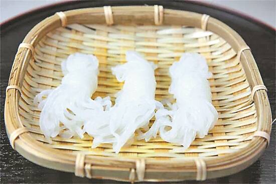 日本人就喜欢将其放入关东煮、寿喜锅、烤物、刺身、面食等。在关东煮里面,魔芋最常见的形态有两种:一种是由魔芋精粉制作成丝,再打结串在竹签上,成为魔芋结。细长的魔芋丝洁白晶亮,有如清流汇聚形成缕缕瀑布的意象,因此日本人给它取了个很有意境的名字“白滝”,也就是白色瀑布的意思。魔芋结经过长时间的熬炖,吸附了味增或者木鱼花出汁的味道,而且久煮不老,爽口弹牙,风味鲜美,是许多人的必点美味之一。