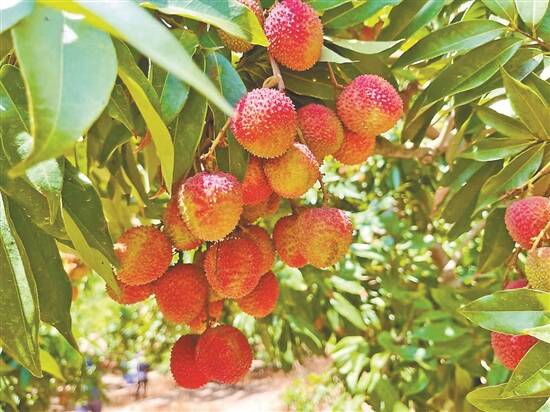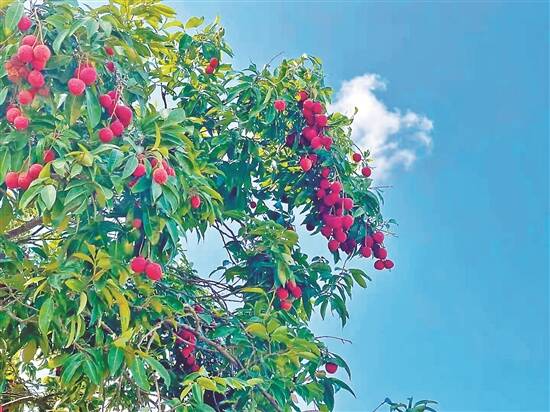 在大赤坎村大迳竹园边的珪鑫果园,2019年嫁接的140多亩御金球果树,今年首次结果。小斗在果园看到,园内每一棵荔枝树都挂满了果实,果实的外皮呈现淡淡的红黄色。果园负责人梁满庭表示,虽然今年第一年结果,但果树生产态势非常好,产量大概有6万斤,再过15天,6月中旬将上市。 (梅尔)