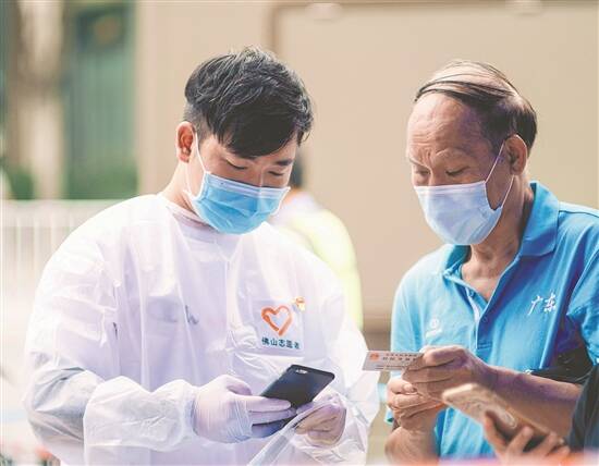 6月5日,团市委的党员志愿者在禅城区丽园广场核酸检测点帮助居民进行扫码认证