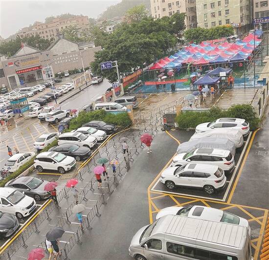 6月12日,端午假期第一天,也是晴雨交织的一天,园山街道参与西坑社区核酸检测的工作人员5时45分就已到位,早上8时许,居民陆续来到各检测点,工作有条不紊地开始了。
