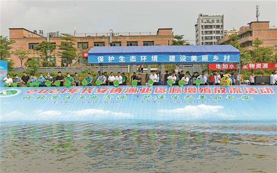 羊城晚报讯 记者王俊伟、通讯员长安宣摄影报道:7月7日上午,2021年东莞市长安镇第十三届“休渔放生节”主题活动在茅洲河5号亲水平台举行。这也是长安连续三年在茅洲河畔举行休渔放生活动,为水清岸绿的茅洲河锦上添花,共建生态美丽长安。