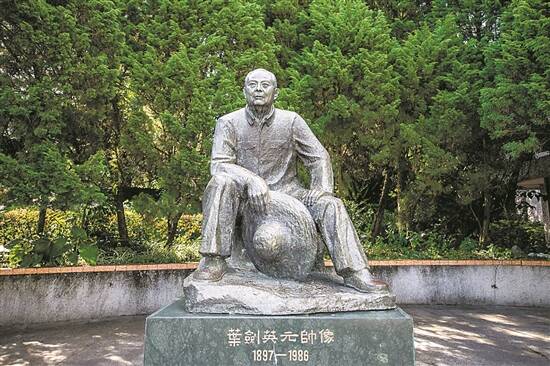 3、叶剑英元帅铜像:纪念馆正门口左侧的台基上,一棵棵翠柏,一簇簇鲜花,掩映着叶剑英元帅的坐姿铜像,铜像高2米,由中国著名的雕塑家刘焕章雕刻而成,像座上镌刻着中共中央撰写的碑文,供人们瞻仰。