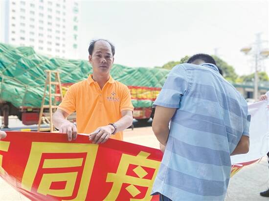 陈宜标(橙色上衣者)即将跟随货车前往河南救灾一线