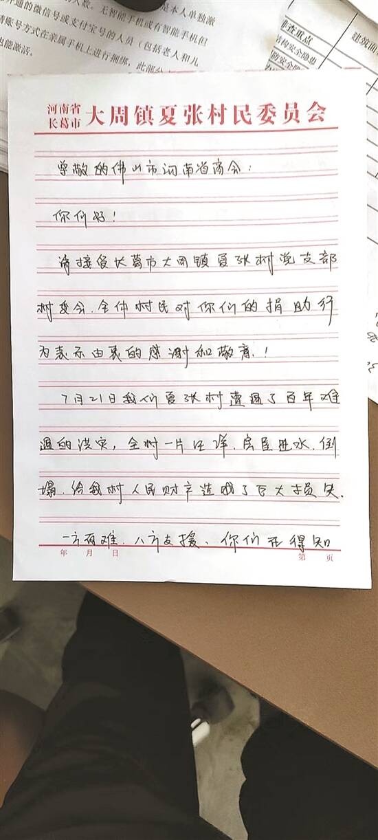 河南灾民给佛山河南商会的感谢信