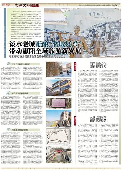 “发动民间力量,凝聚民间智慧。”惠阳区文广旅体局党组书记、局长陈惠忠介绍,淡水老城是惠阳深厚的历史文化底蕴和城市魅力的体现,“名城复兴”成为惠阳区推进全域旅游建设的重要支撑。目前,全区正加紧推进《惠阳淡水老城文化旅游休闲区总体规划》项目,重点开发淡水老城文化旅游资源,进一步整合、活化和丰富惠阳文化旅游资源。