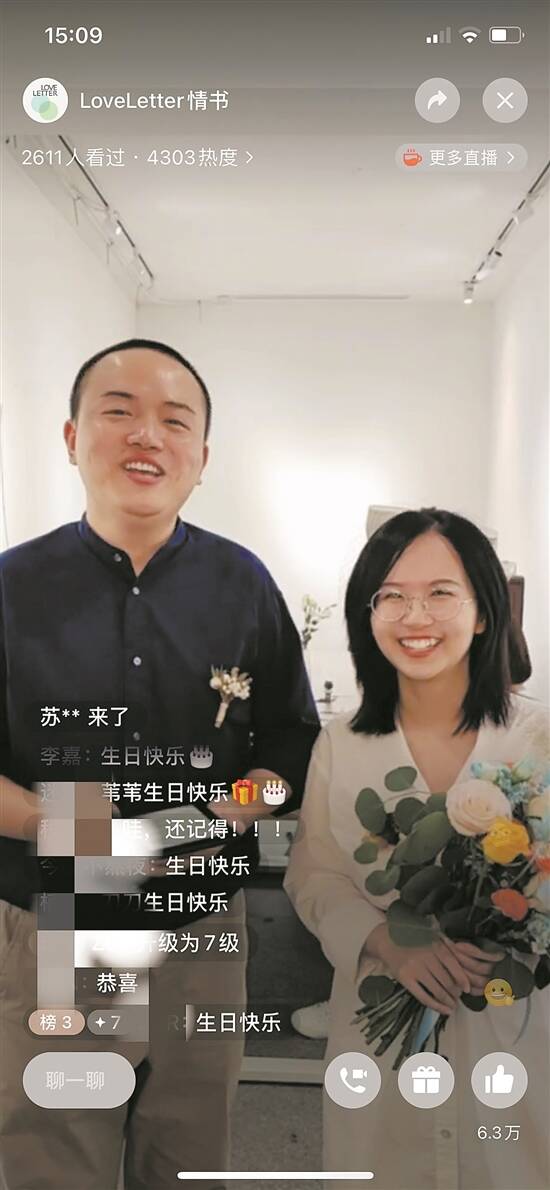 没有隆重礼服,没有家长致辞,在这场历时1小时20分钟的仪式里,朝朝一苇以及他们的朋友们总共对着直播镜头朗读了五封“情书”,抽了四轮奖,哭了好几次,笑了无数次。前后共有超过3000人次在线观礼,人们在弹幕中说“美好”“又是为别人的爱情落泪的一天”“我又相信婚姻了”。
