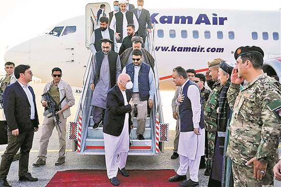 阿富汗总统加尼(中)8月11日乘机抵达巴尔赫省首府马扎里沙里夫,视察鼓舞士气 视觉中国