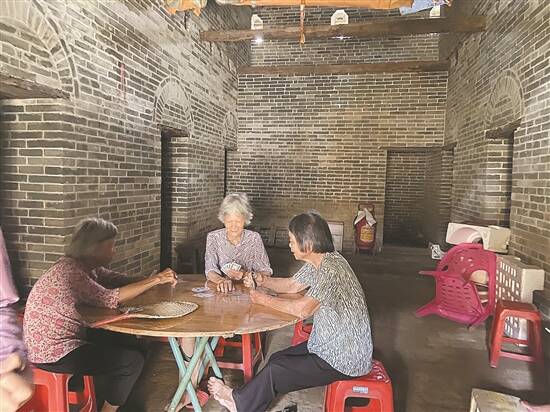 在见龙围右边,一座雄伟的炮楼颇为吸睛。记者看到,炮楼由5层楼高的青砖砌筑,内部宽敞,木梁交错支撑着各楼层。走访当天,天气炎热,不少村民搬着凳子,坐在楼内避暑,十分休闲惬意。从外观看来,炮楼的主体结构依旧完好如初,只是木梁和楼板年久失修,逐渐被腐蚀坍塌。