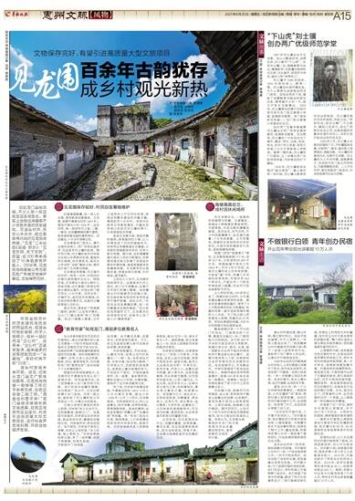 渡头村发展未来可期。近日,记者从龙门县文广旅体局获悉,见龙围与炮楼一期修缮工程已于去年完成,目前正准备二期工程。“酒香也怕巷子深!”龙门县地派镇镇长赖文城透露,目前正与意向企业接洽,有望引进高质量大型文旅项目,进行综合开发与利用,带动当地经济发展。