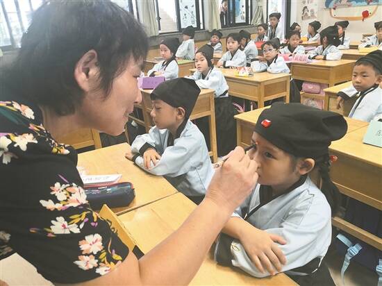 仪式开始,在庄严的奏唱国歌后,由三年级同学带领新生诵读《弟子规》,引导新生在学校尊师重道、友爱同学,在家孝亲敬长,良好的品行从点滴开始。随后,由学校领导及各班班主任为一年级新生点朱砂启智,在学生的额头正中点上红痣,有着“开蒙启智”的美好寓意,给予孩子“立大志,成大才”的美好祝愿。